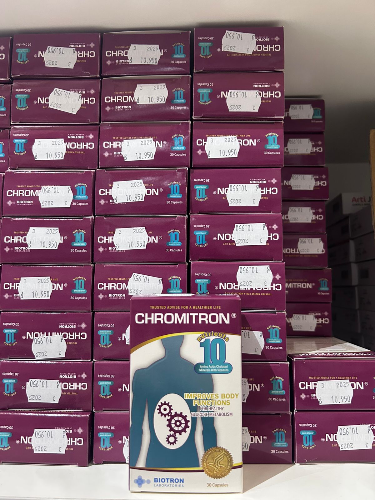 Chromitron is a food supplement used to support metabolism in the body, as it contains several rich elements such as amino acids, bioflavonoids, biotin, chromium and others These components have the effect of supporting the body’s metabolic processes, as it improves the sensitivity of insulin receptors and regulates blood sugar levels, and has a role in reducing harmful cholesterol and increasing the rate of burning fat and starches, which helps to reduce weight, in addition to its usefulness in relieving problems Polycystic ovary syndrome due to its androgen-lowering effect