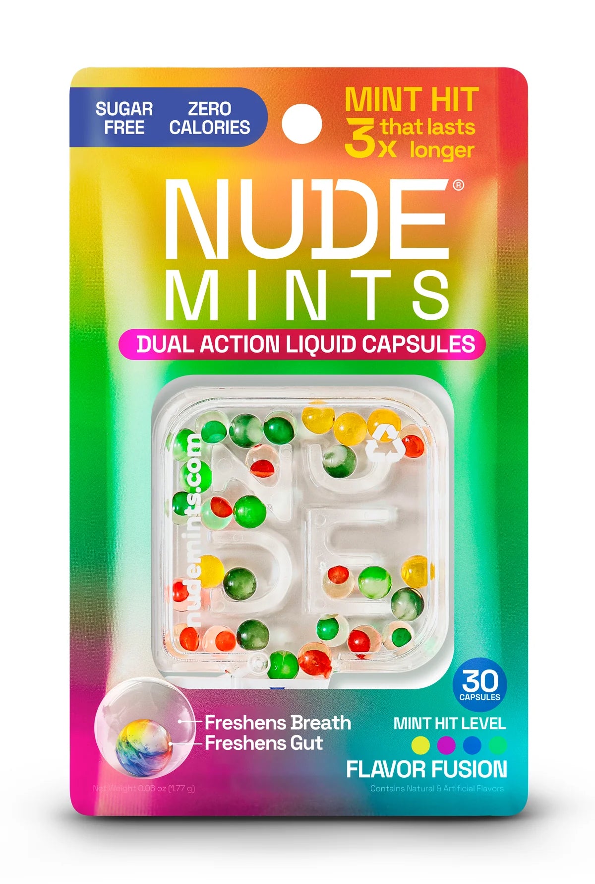 Double action liquid capsule technology provides an instant peppermint blast followed by an inner capsule that delivers deep gut freshness.