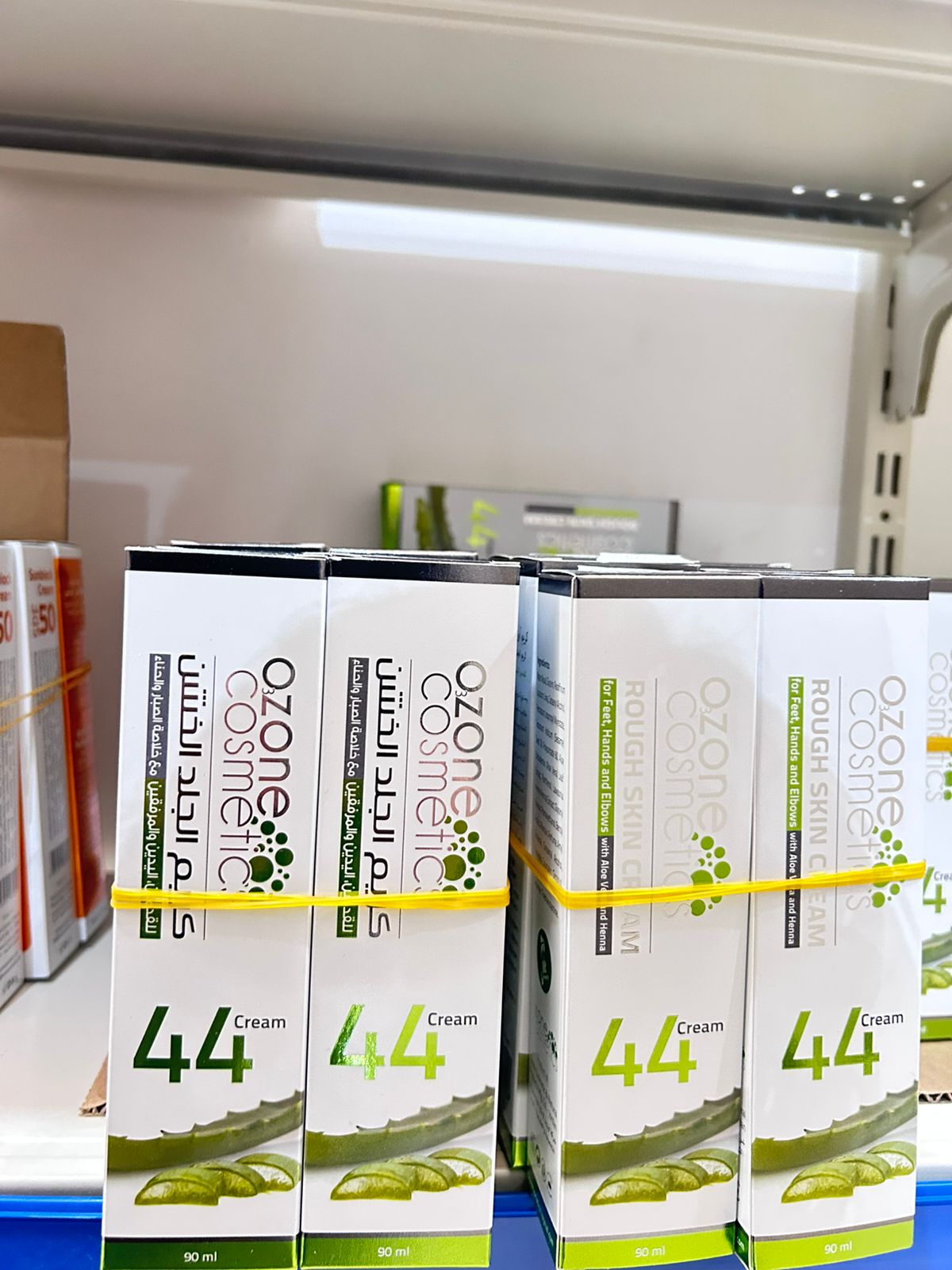 يحتوي كريم اوزون 44 على خلاصة الصبار وخلاصة الحناء؛ مما يساعد على ترطيب البشرة، وحمايتها من الفطريات والتقليل من امتصاص الماء من المحيط الخارجي للبشرة مما يجعله المستحضر المثالي للعناية بالجلد وإبقائه ناعماً ورطباً، يستخدم للعناية بالمناطق الجلدية الخشنة خصوصاً (للقدمين، اليدين، المرفقين ).